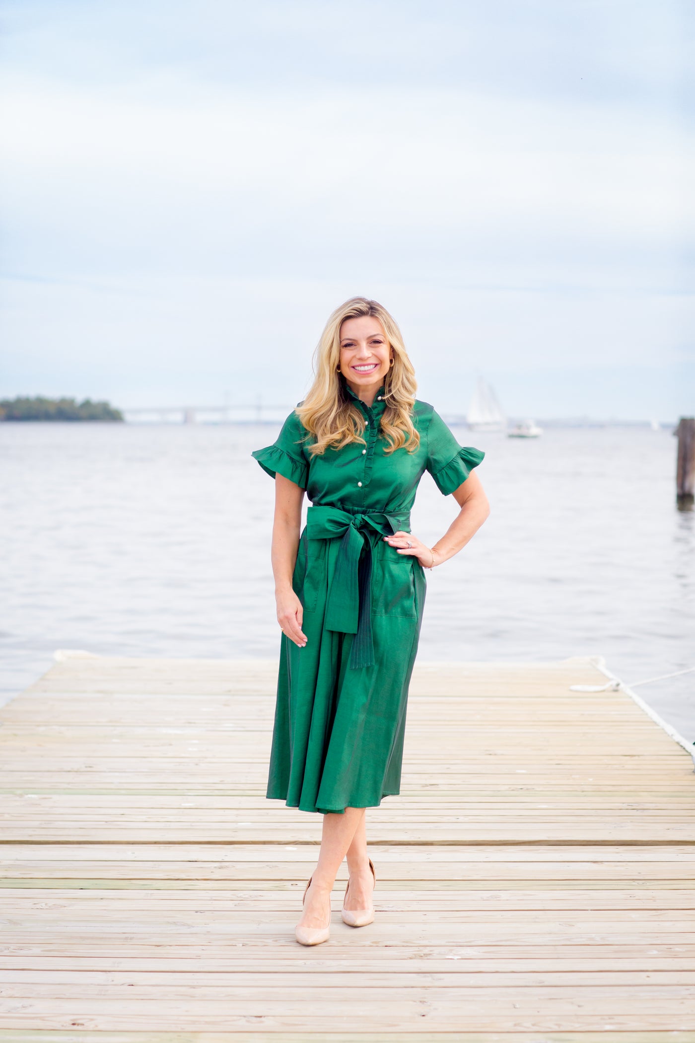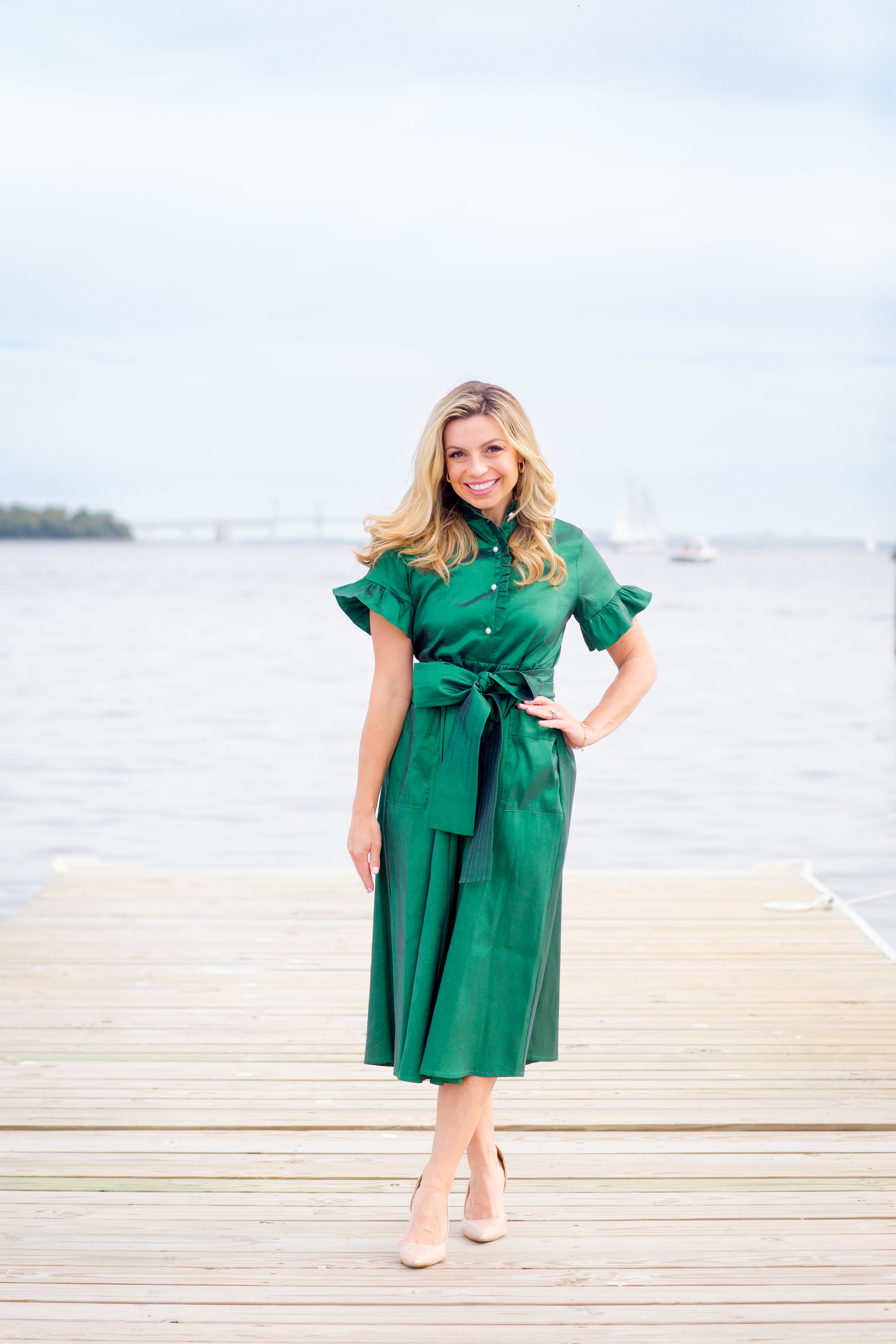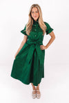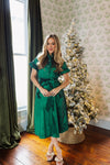 Add a polished touch to your wardrobe with this gorgeous emerald green holiday dress featuring elegant pearl accents & two front pockets. The button-up neckline & sleek silhouette create a chic, refined vibe - perfect for special occasions or stylish family photos. Pair with your heels for a complete, holiday look!