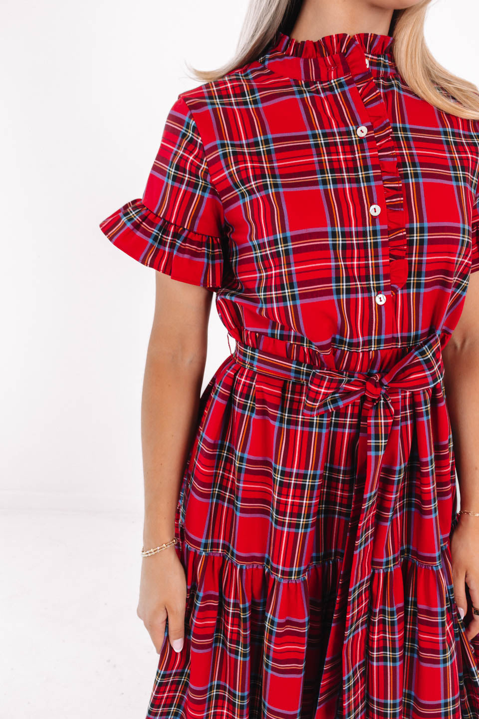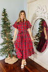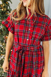Bring holiday cheer to your wardrobe with this festive red plaid midi dress, featuring a classic button-up neckline & an adjustable tie belt. The cheerful print & flattering silhouette bring a joyful, seasonal charm - perfect for holiday gatherings. Pair with your favorite heels for the perfect holiday look!