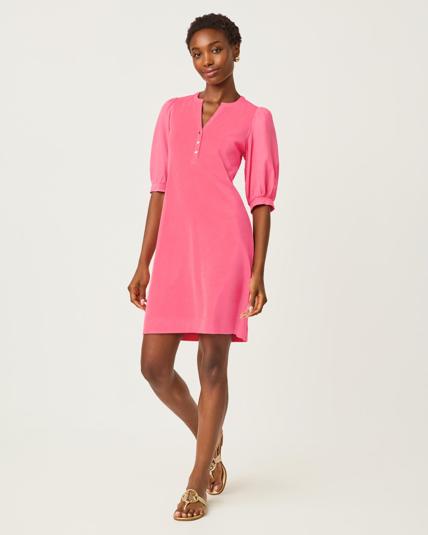 Effortlessly chic and timelessly elegant, this popover dress features a flattering v-neck and romantic puff sleeves that capture understated sophistication. Gold buttons trace the front, adding a refined touch to this versatile piece. Perfect for spontaneous coffee outings or breezy vacation days, it's the kind of dress that transitions seamlessly from casual to polished without requiring a second thought. A wardrobe essential that delivers both comfort and style.