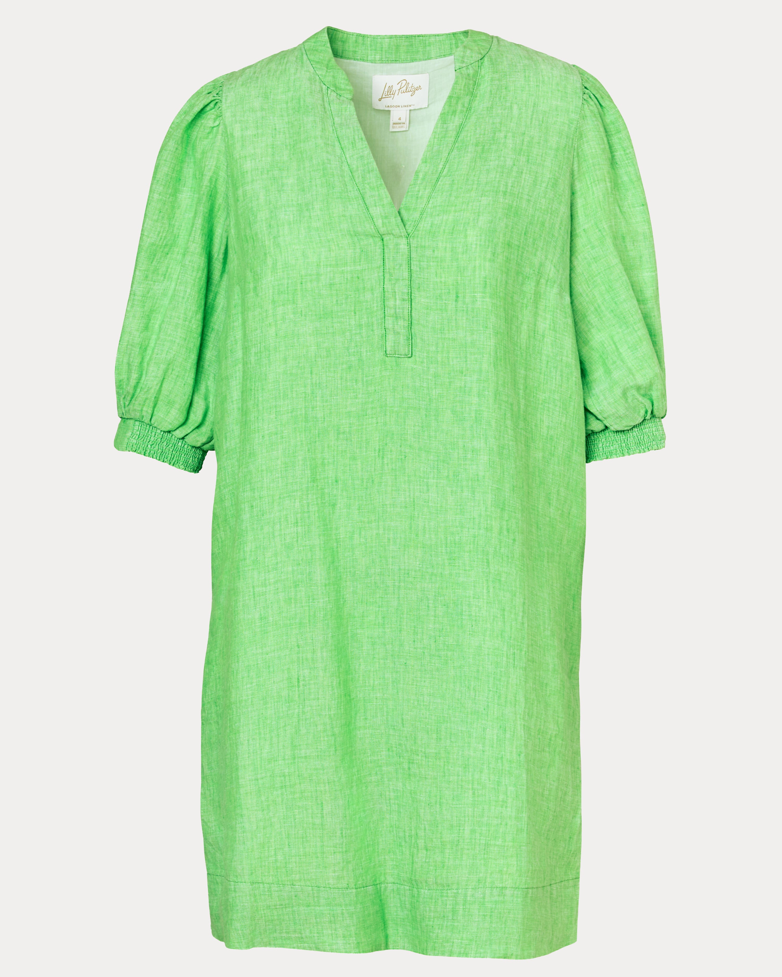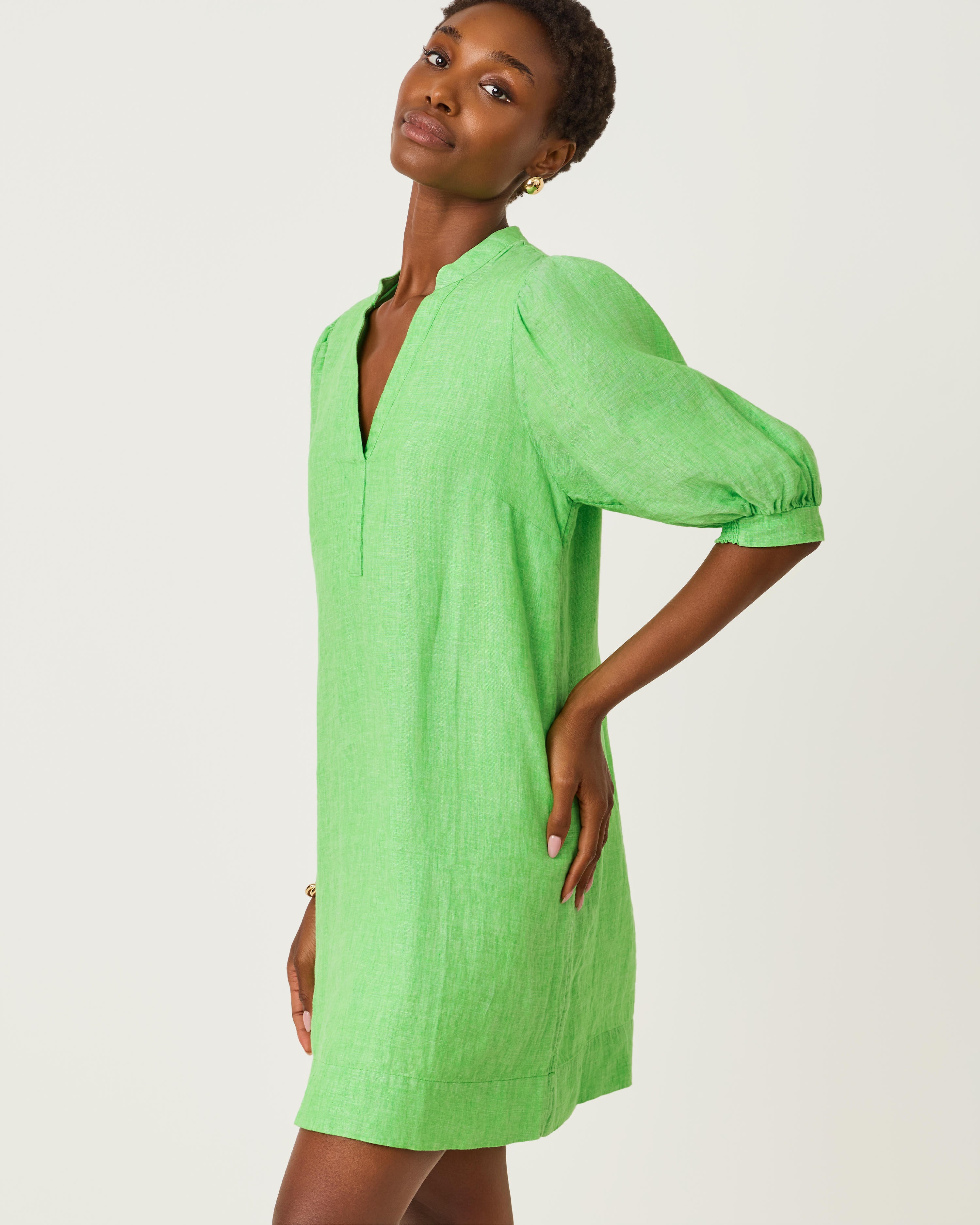 - Easy fit, popover dress with a stand collar, half placket, and elbow-length puff sleeves.