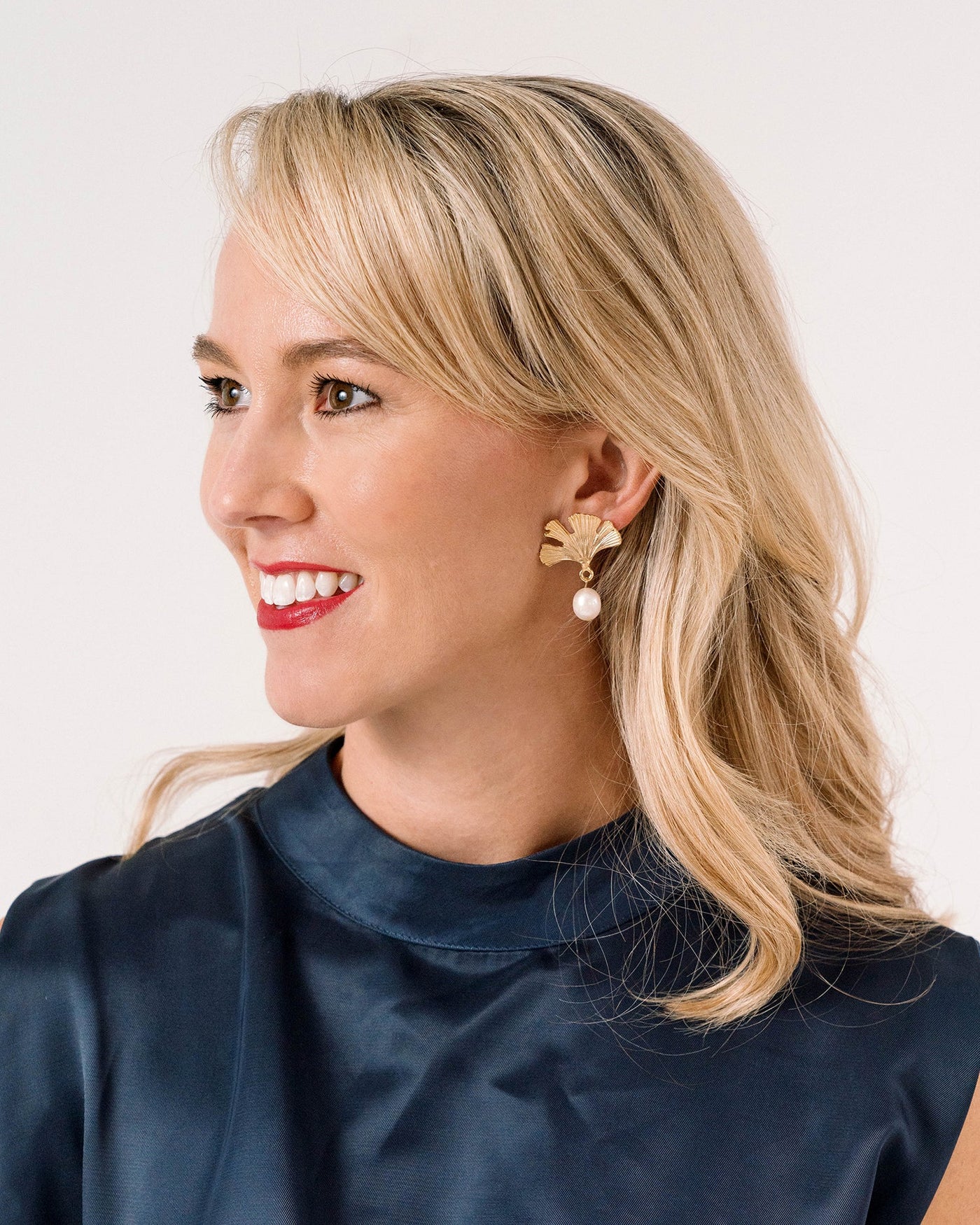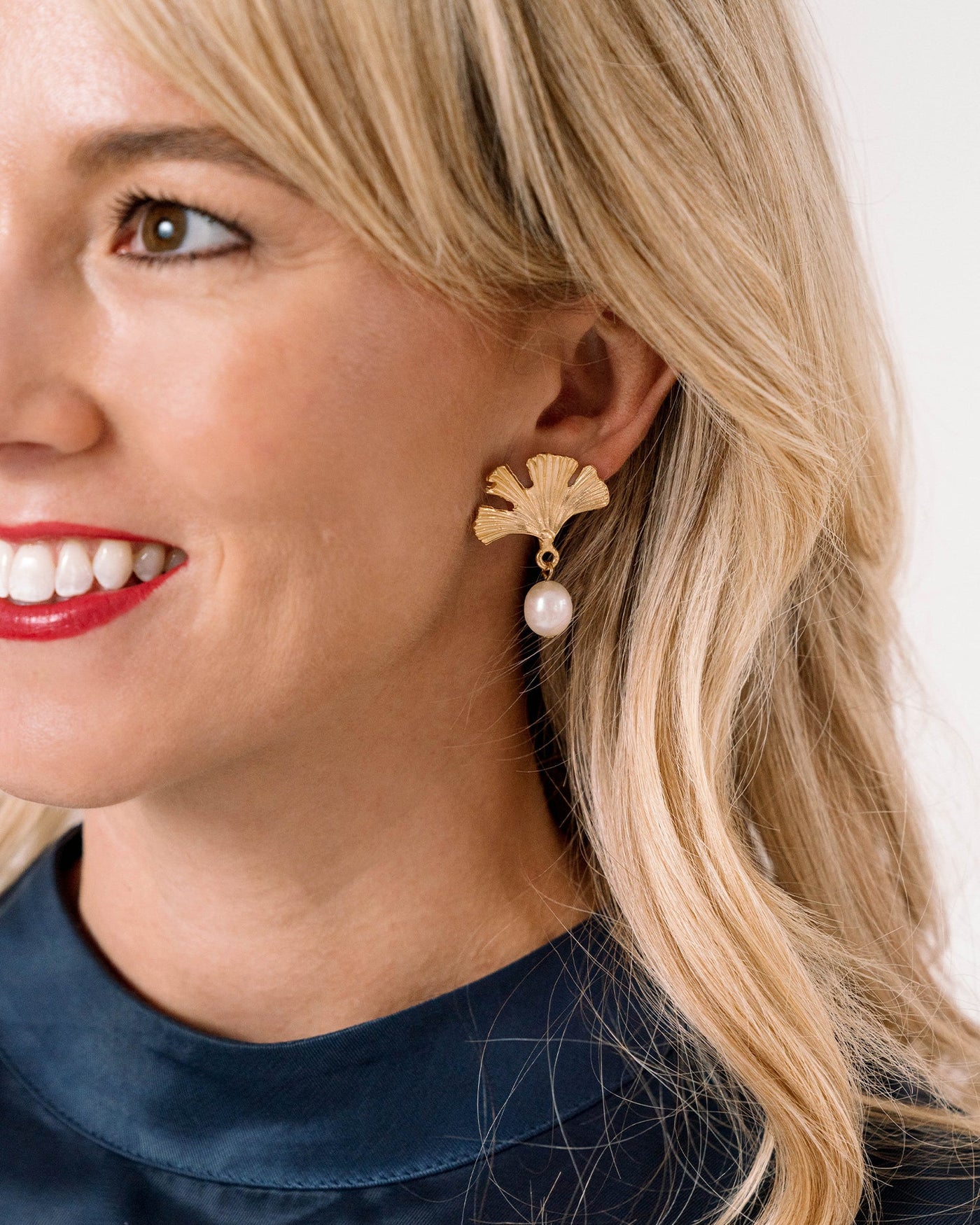 Susan Shaw Mini Ginkgo and Pearl Drop Earrings